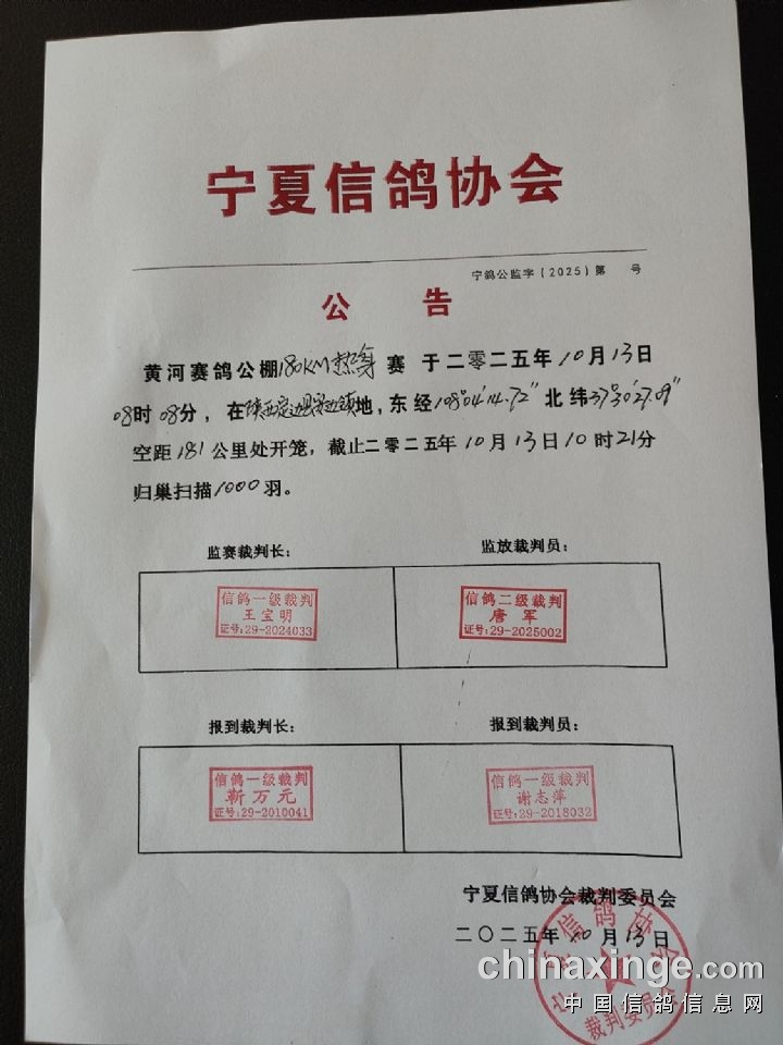 宁夏黄河赛鸽公棚第一关300公里奖金领取通知