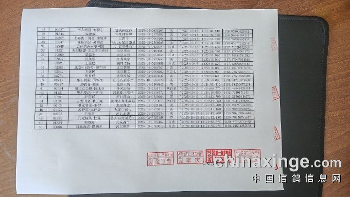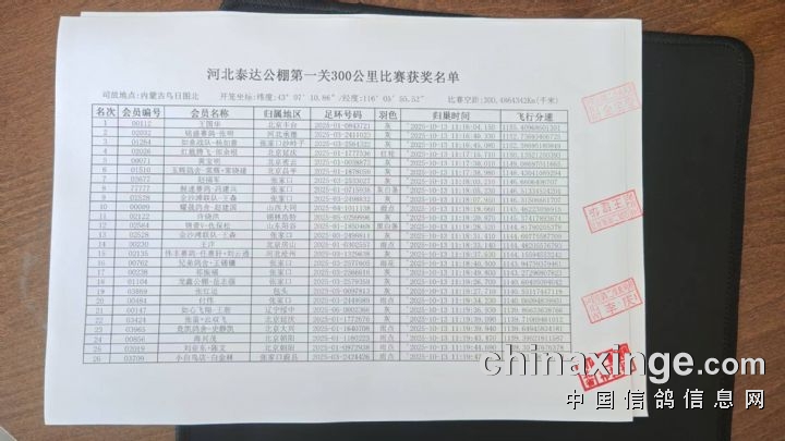 河北泰达公棚第一关300公里比赛集鸽数据(按序号)