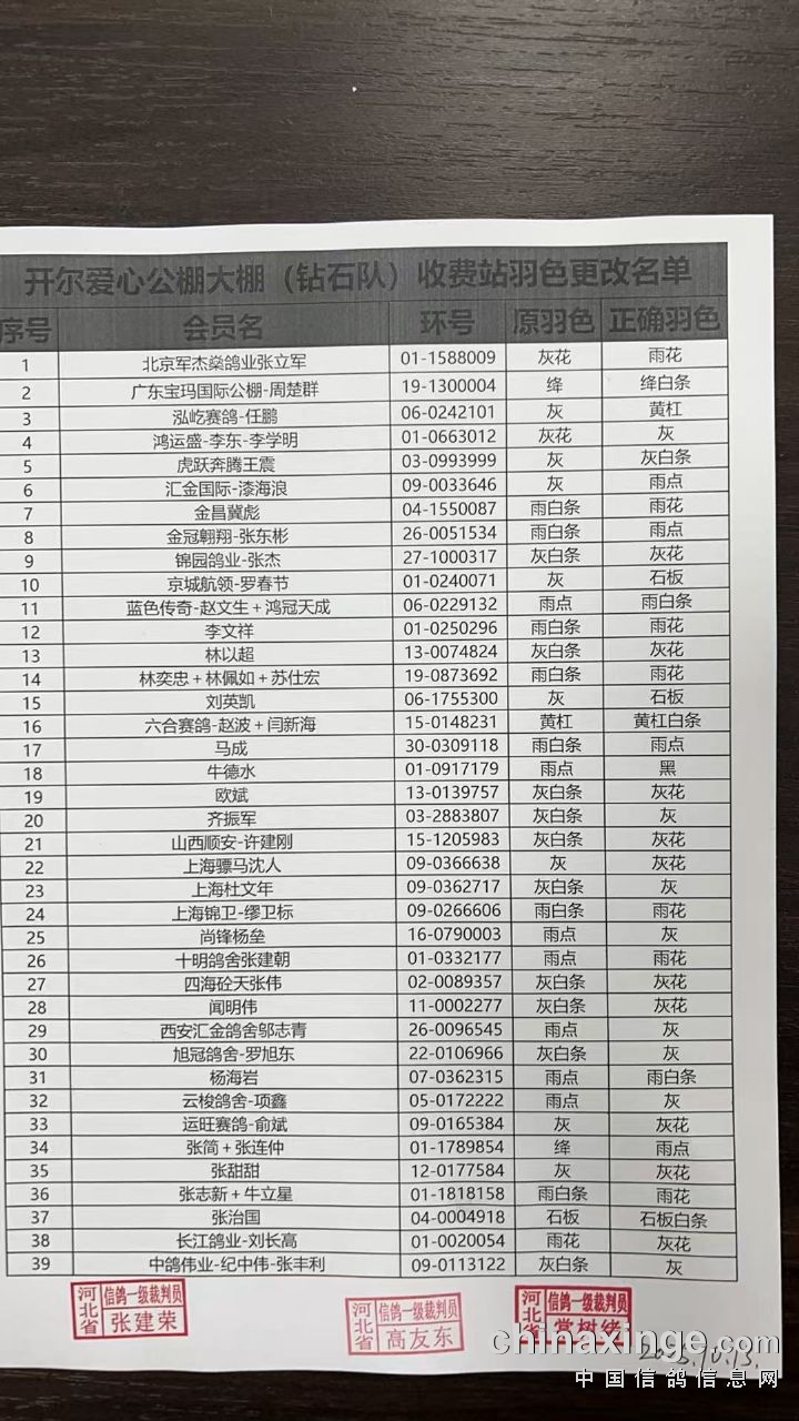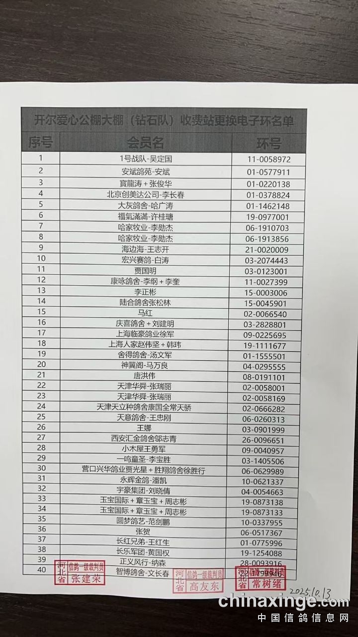 开尔爱心公棚大棚(钻石队)收费站更换电子环与修改羽色名单