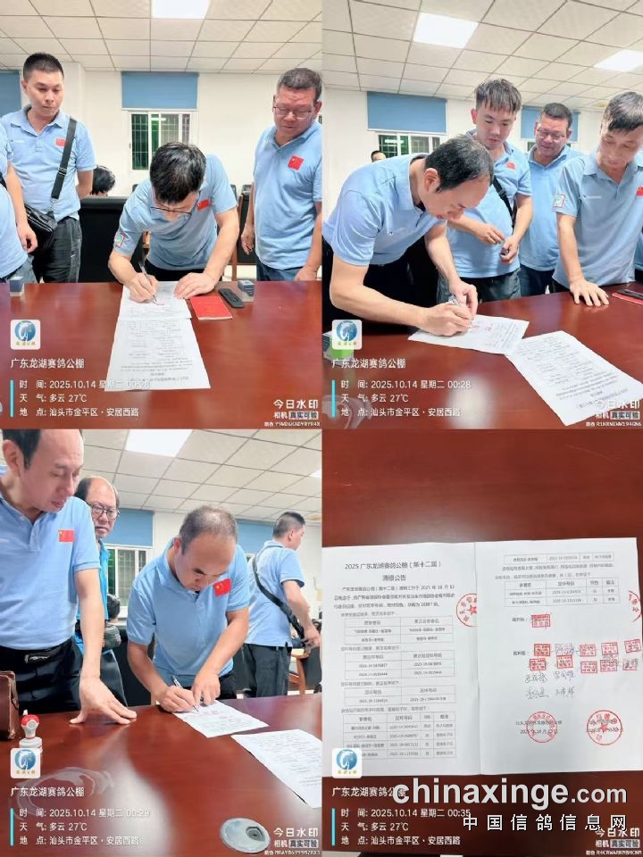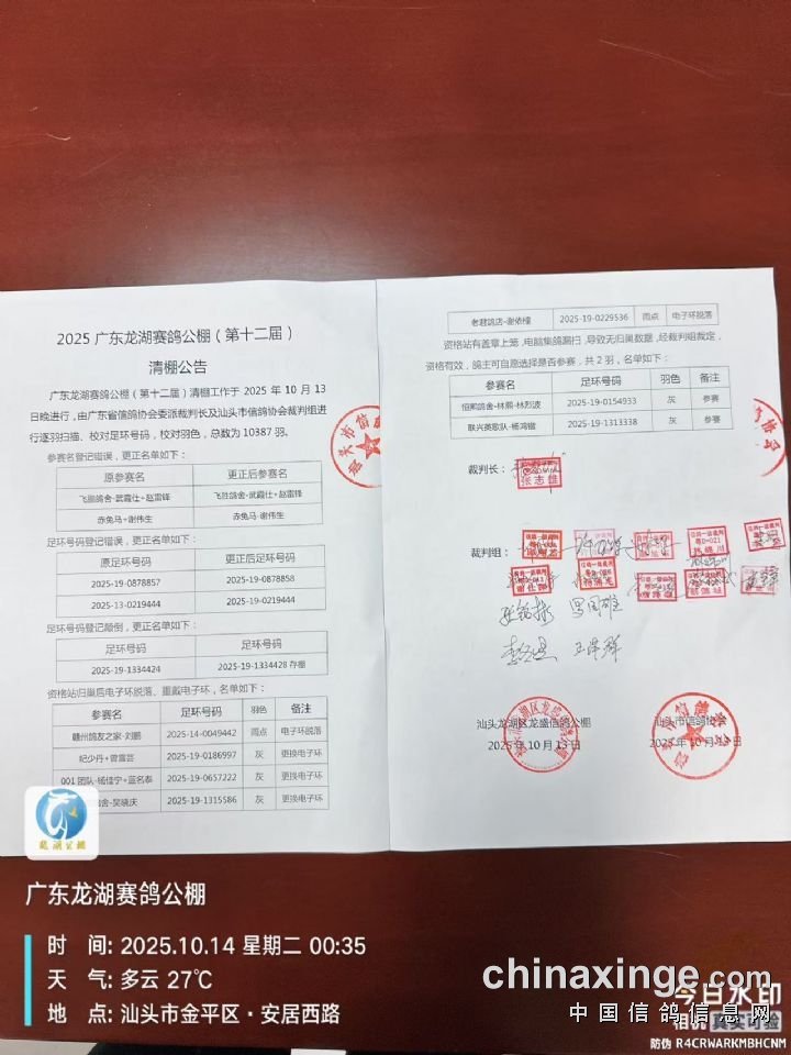 广东龙湖赛鸽公棚(第十二届)清棚工作于2025年10月13日晚进行,由广东省信鸽协会委派裁判长及汕头市信鸽协会裁判组进行逐羽扫描、校对足环号码,校对羽色,总数为10387羽。