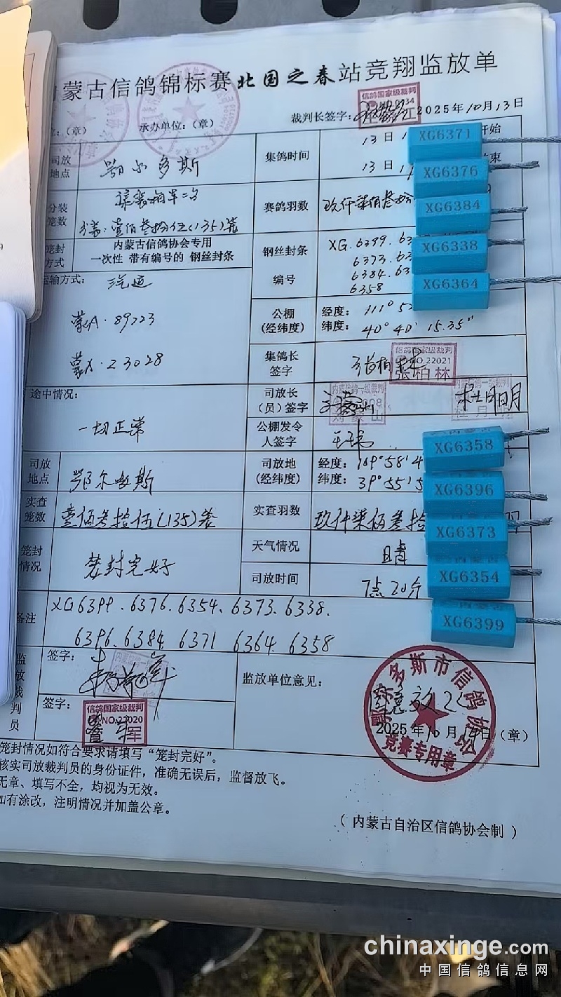 内蒙古信鸽锦标赛“鸽王排名赛”北国之春站第一关热身赛于2025年10月14日7:20在内蒙古鄂尔多斯市东胜区开笼放飞。司放地天气晴朗,鸽群走势良好,预祝参赛鸽友取得优异成绩。