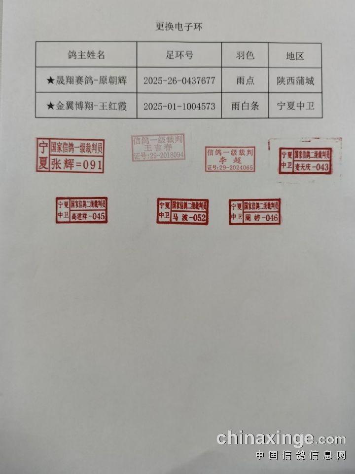 宁夏中卫赛鸽公棚180公里热身赛更换电子环名单