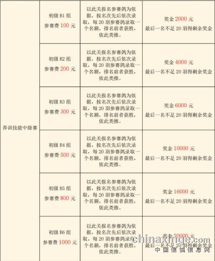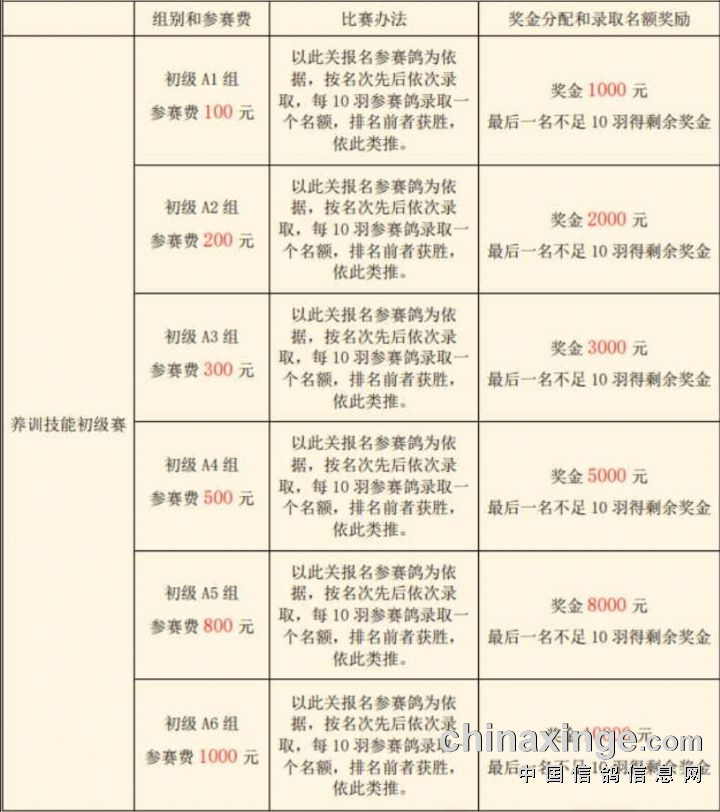 养训技能赛参赛鸽自开笼时间起至当日晚18点为有效报到时间。如司放当日无鸽归巢,则当关养训技能赛结束,退还养训技能赛报名费用;如在有效报到期内获奖名次未报满,则剩余名次奖金由当关上笼参加该奖项的上笼鸽均分(不包括获奖鸽)。