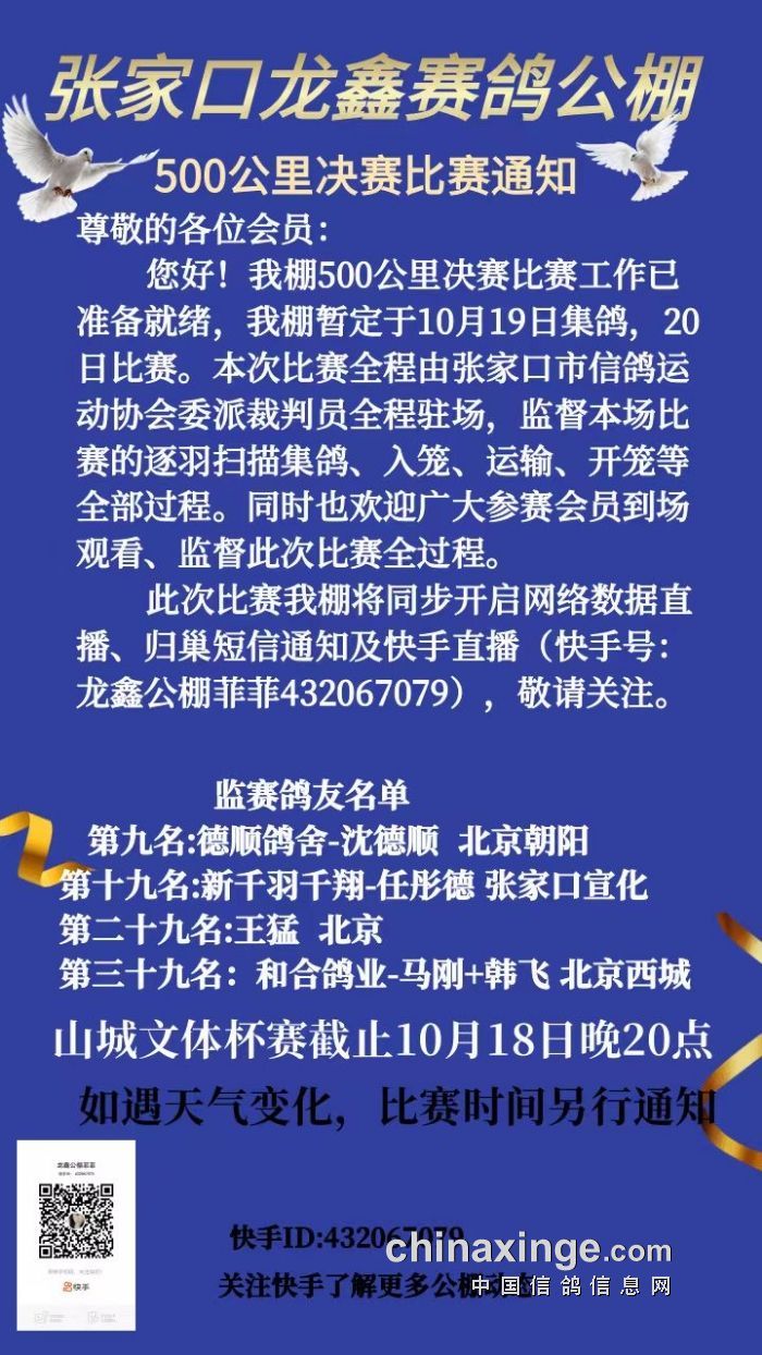张家口龙鑫公棚500公里决赛比赛通知