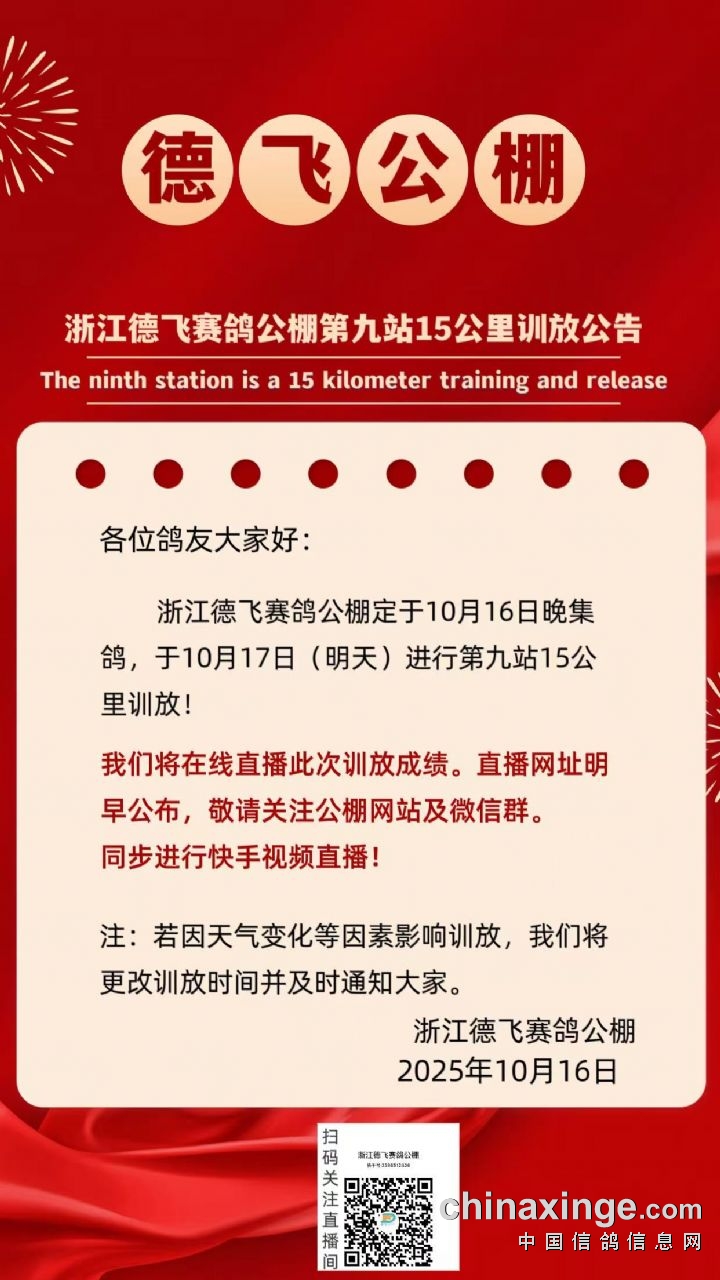 浙江德飞赛鸽公棚第九站15公里训放公告