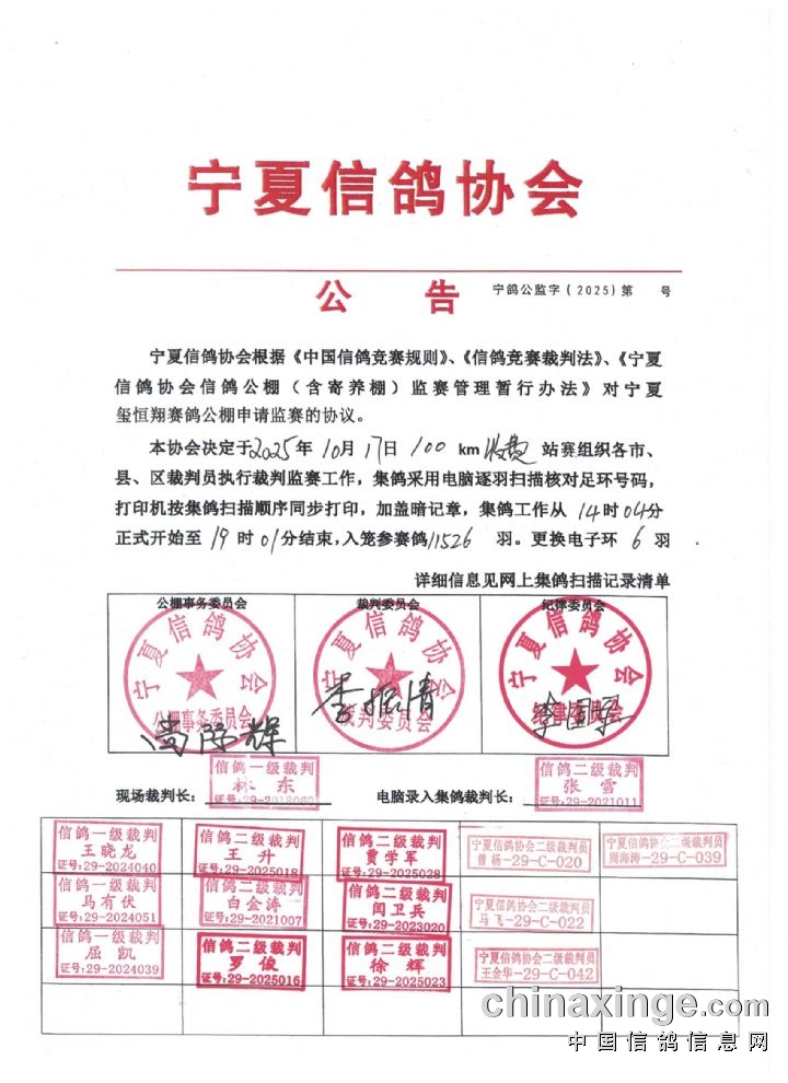 宁夏玺恒翔赛鸽公棚100公里清棚站集鸽明细(按顺序)