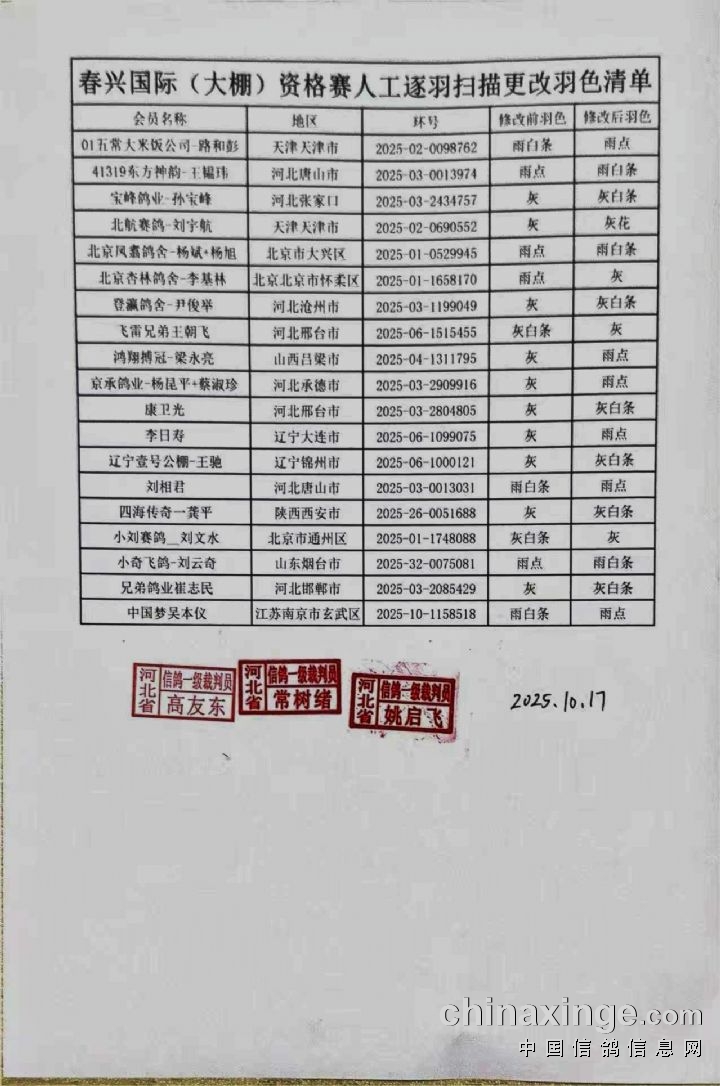 春兴国际(大棚)资格赛第三日归巢数据(按会员,不排除漏扫及电子环损坏等情况)