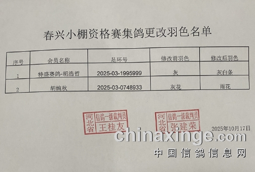春兴国际(小棚)资格赛更改羽色清单