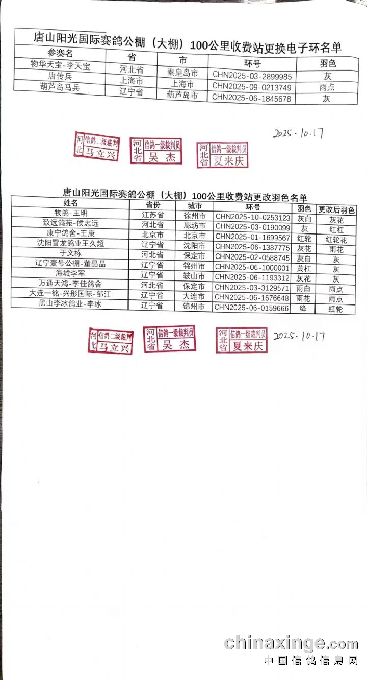 唐山阳光大棚90-110公里收费站更改羽色、更换电子环名单