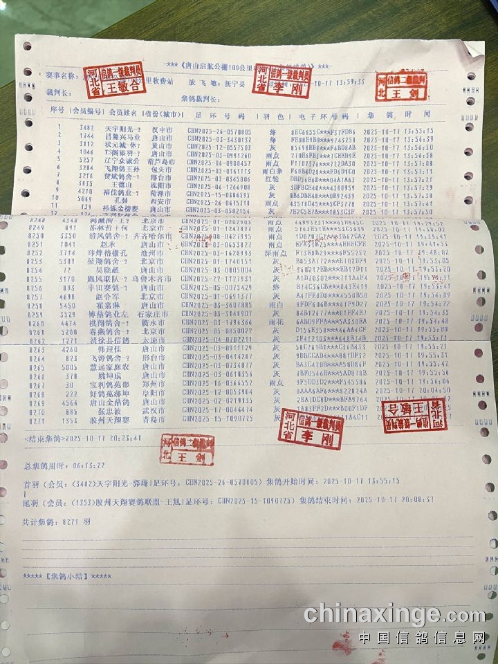 百公里收费站集鸽清单鸽会盖章、监放鸽友签字