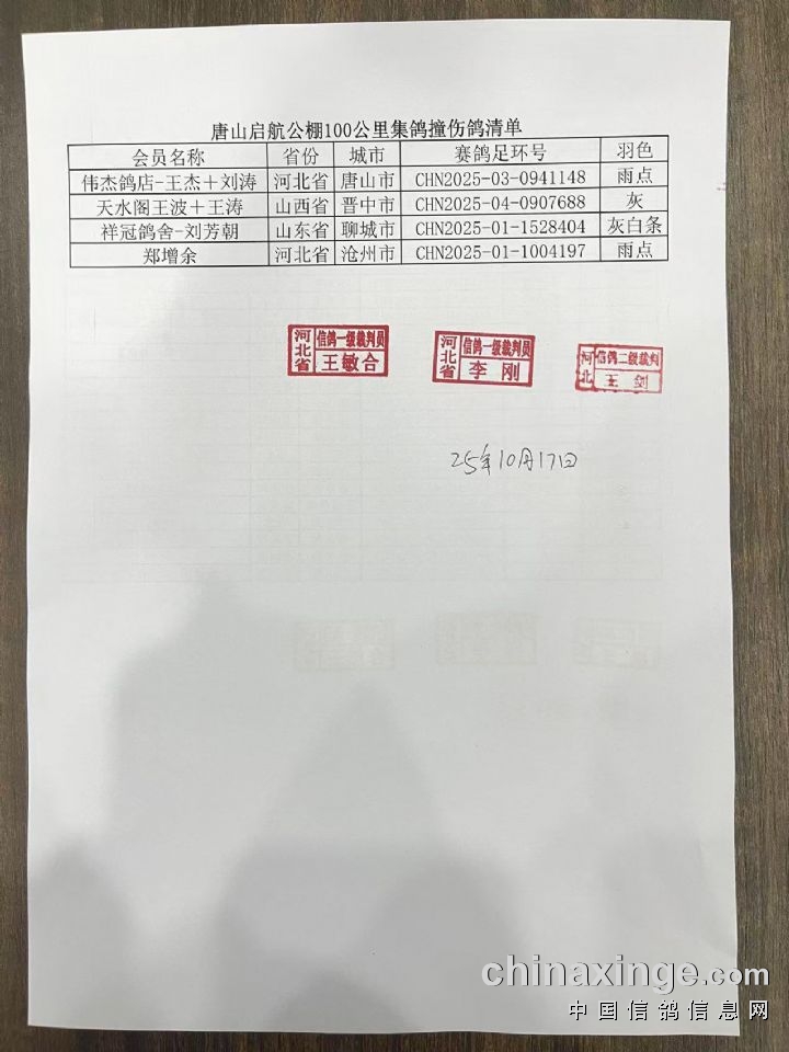 唐山启航公棚>180-220公里资格赛小团体获奖鸽名单