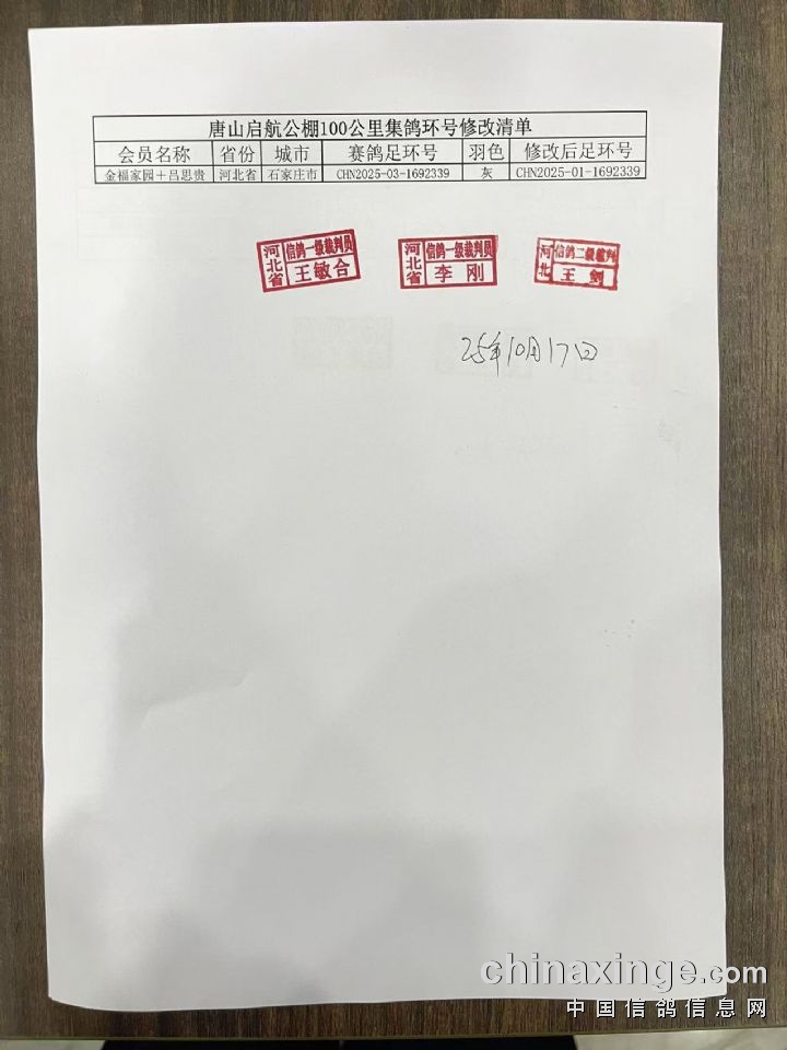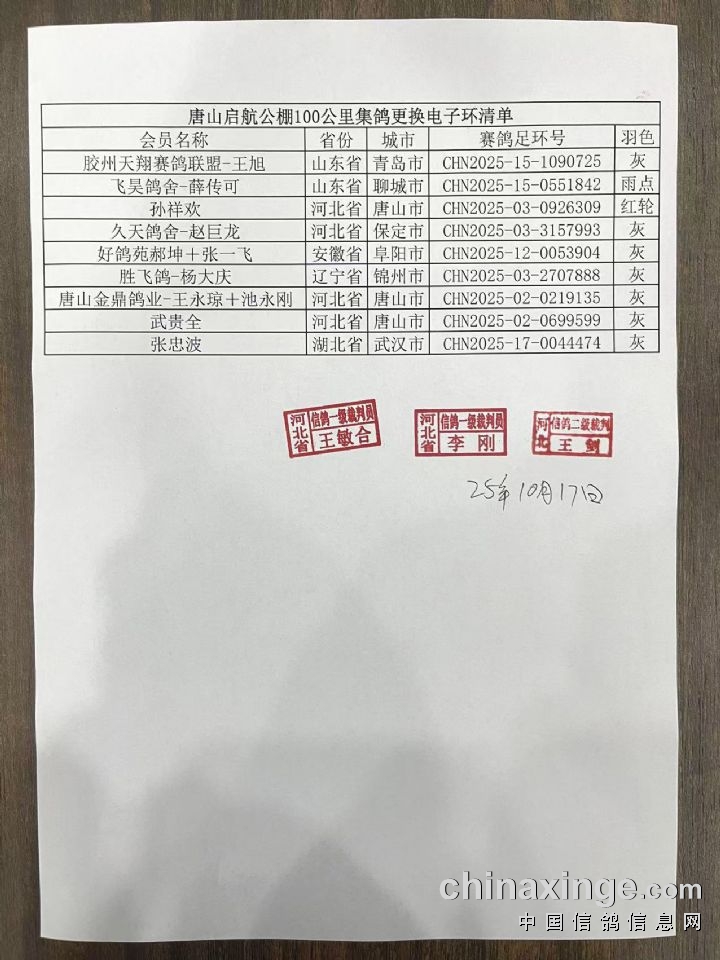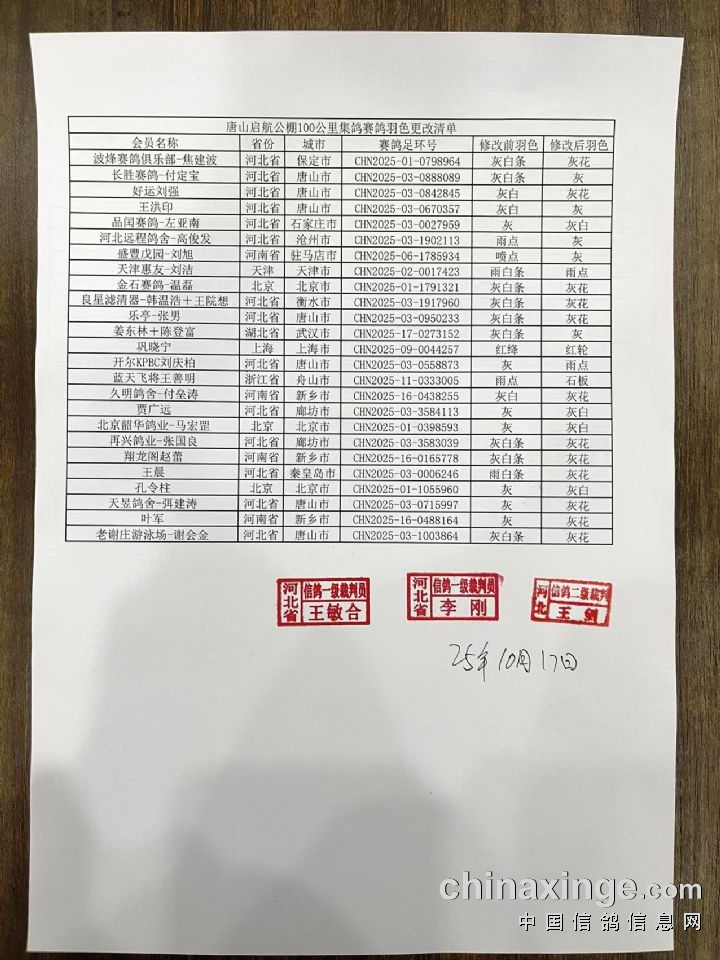 唐山启航公棚>180-220公里资格赛更换电子环及羽色修改清单