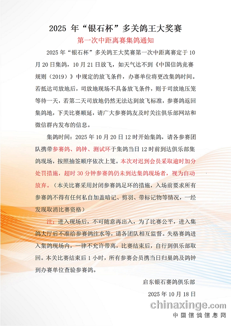 2025年"银石杯"多关鸽王大奖赛第一次中距离赛集鸽通知