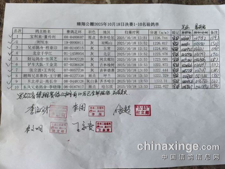 臻翔公棚530公里决赛前十名验鸽名单