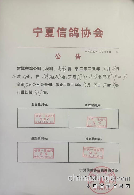 宁夏君翼赛鸽公棚(秋棚)400公里比赛通知