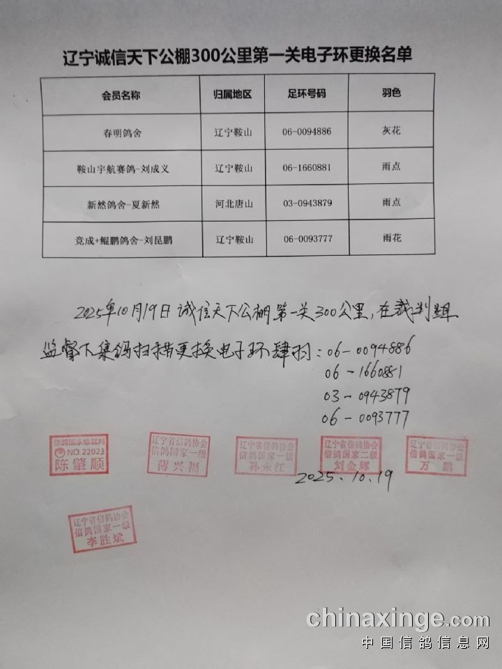 辽宁诚信天下公棚520公里决赛彩鸽获奖名单
