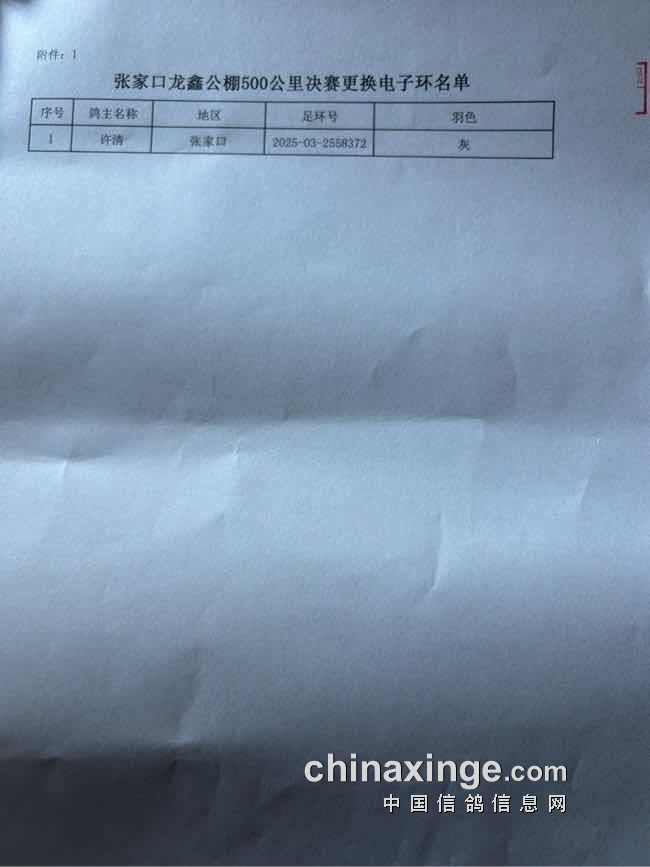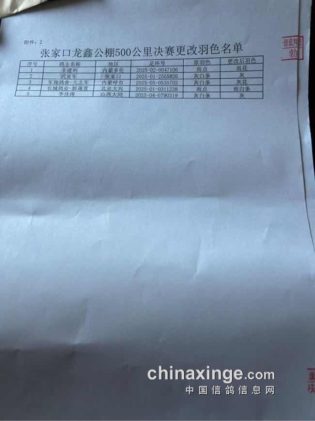 张家口龙鑫公棚500公里决赛前900名获奖名单证明