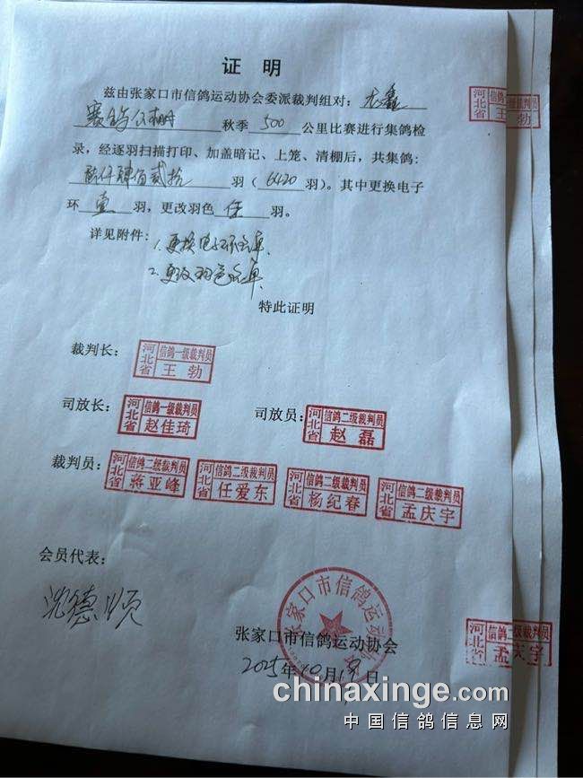 河北张家口龙鑫公棚500公里决赛集鸽证明及现场图片