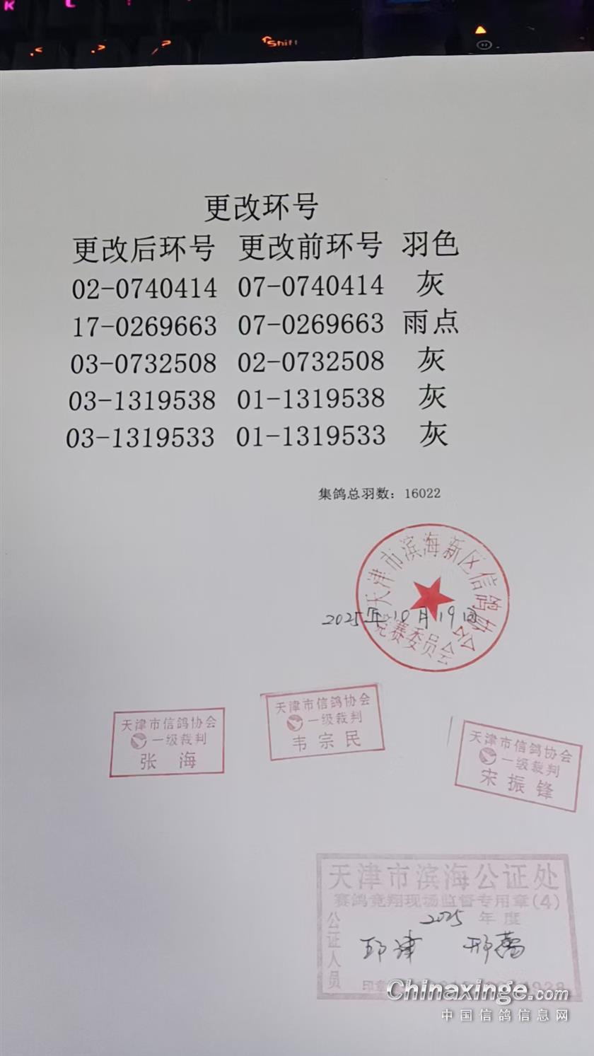 天津市丽翔国际赛鸽公棚更改环号明细