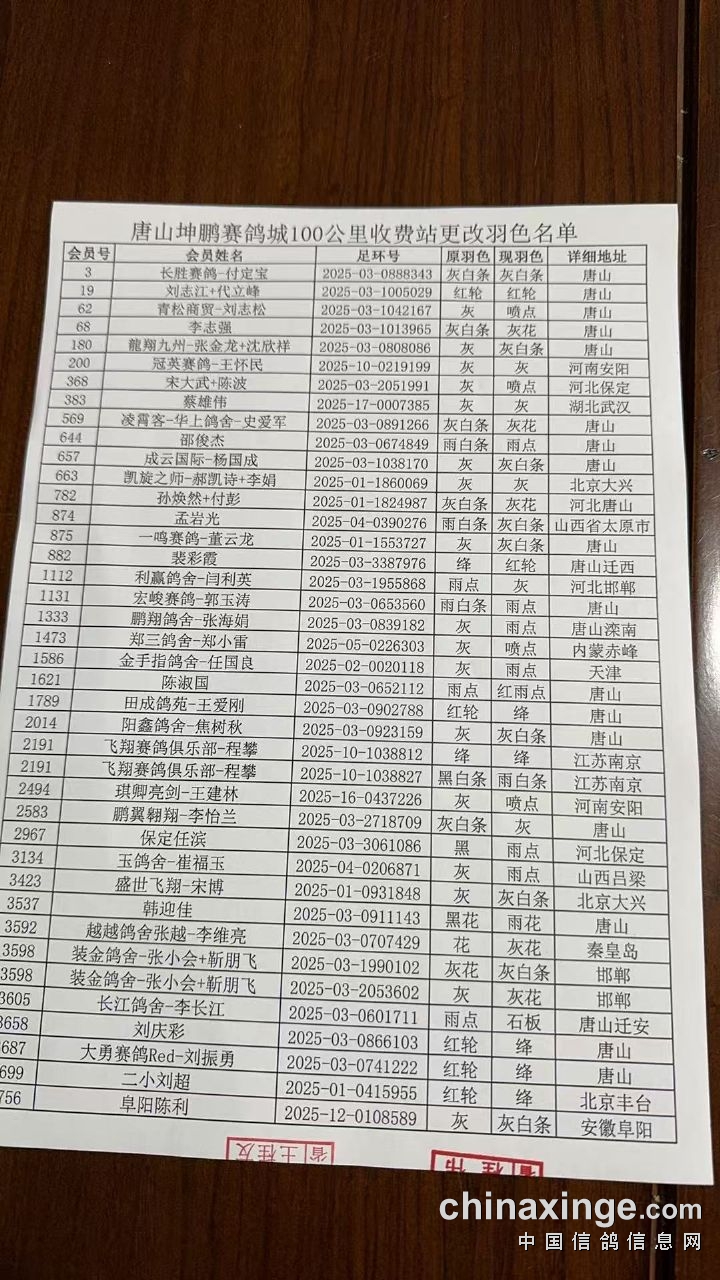 唐山坤鹏赛鸽城100公里收费站(会员顺序)