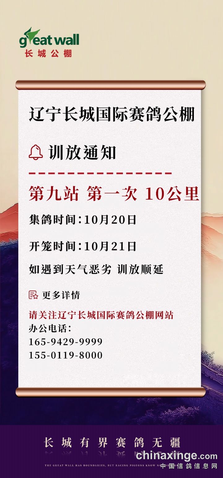 辽宁长城国际赛鸽公棚第九站第一次10公里训放通知