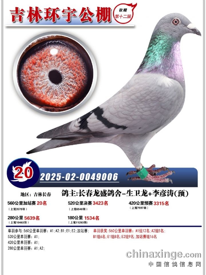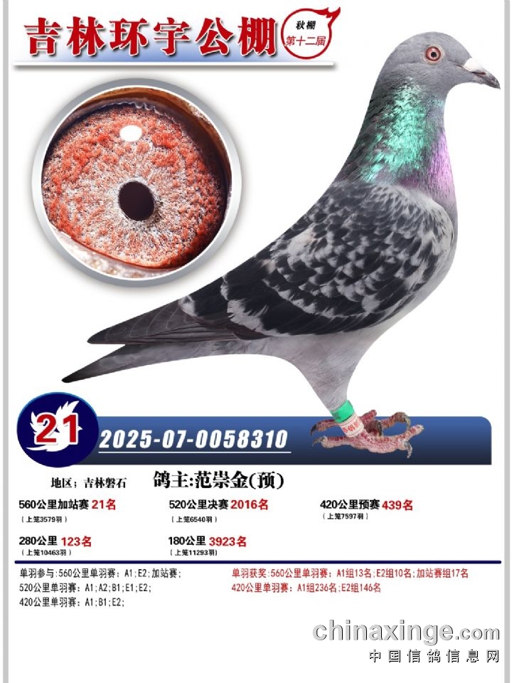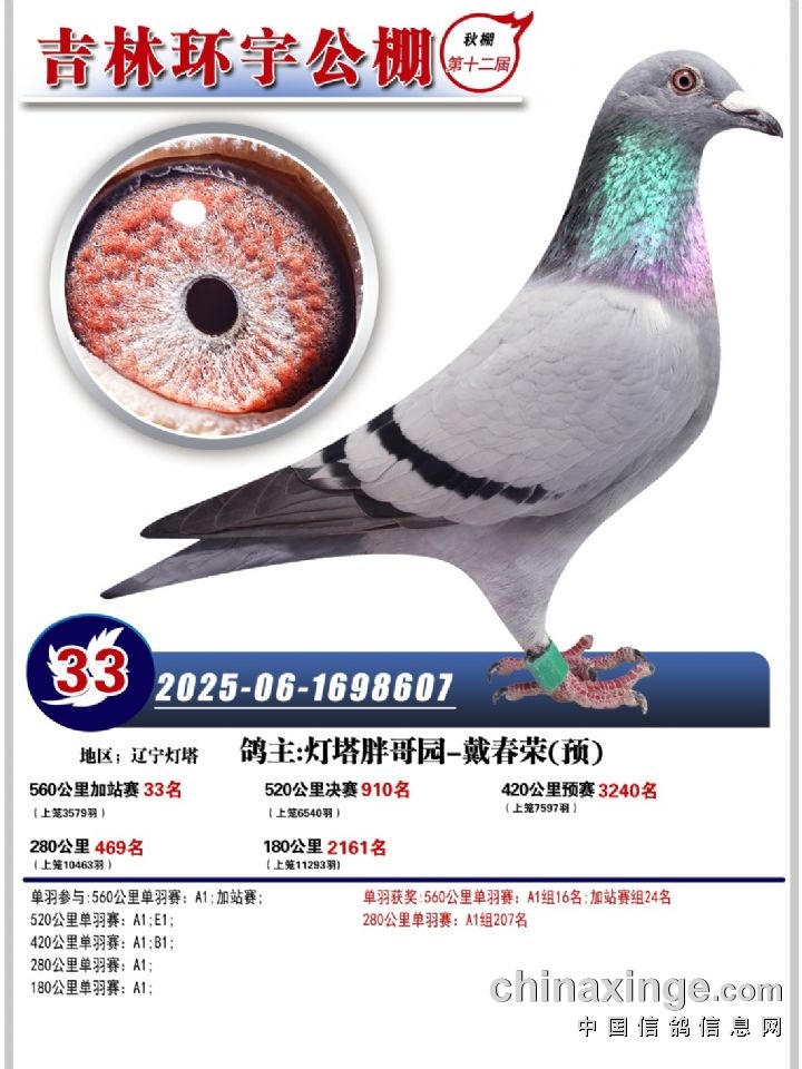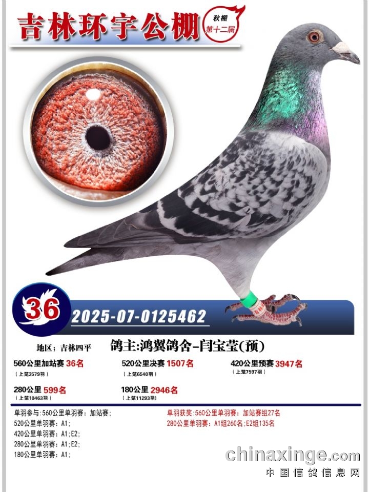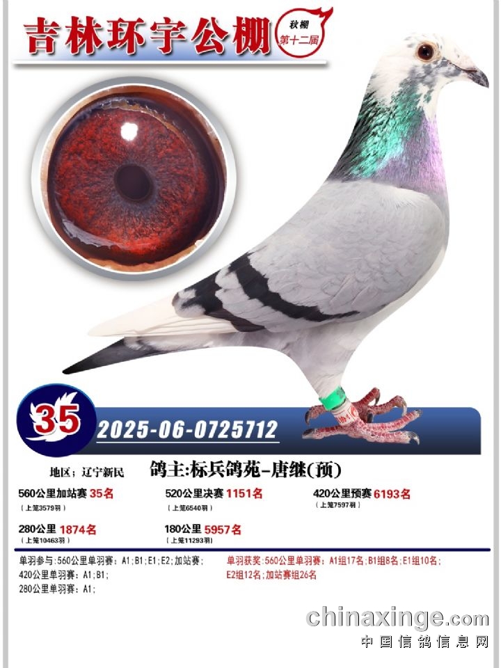吉林环宇(小)2025年加站赛1-15名获奖鸽照片赏析