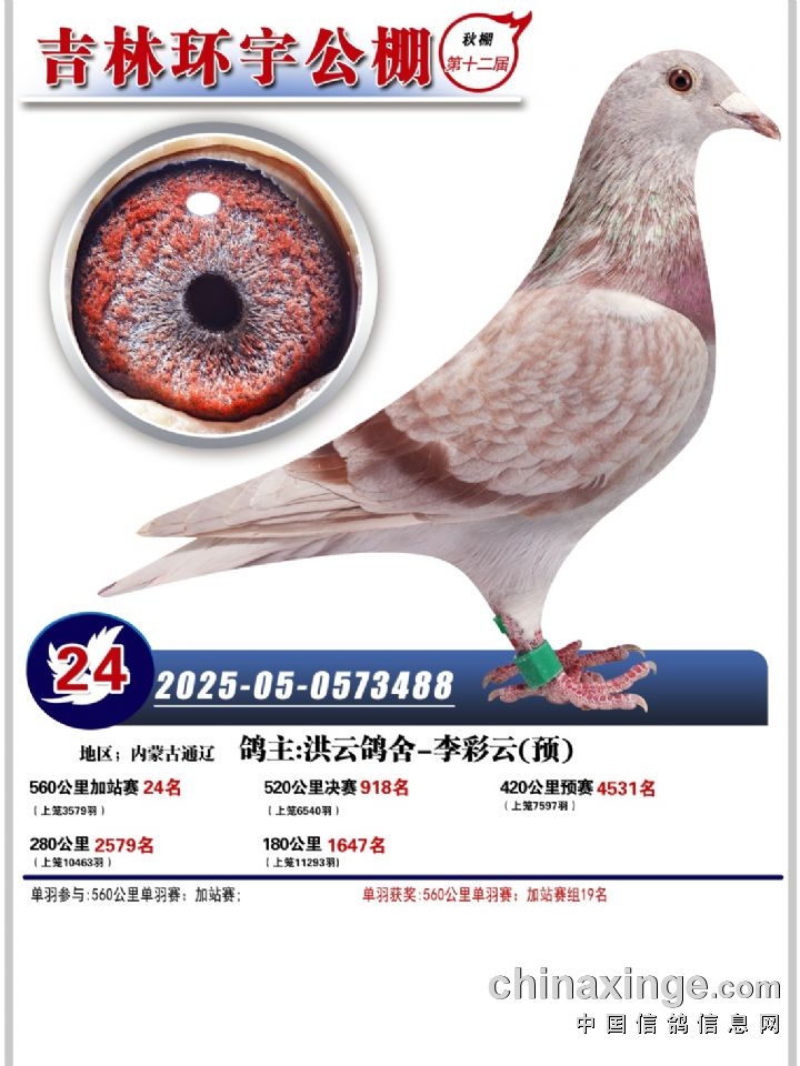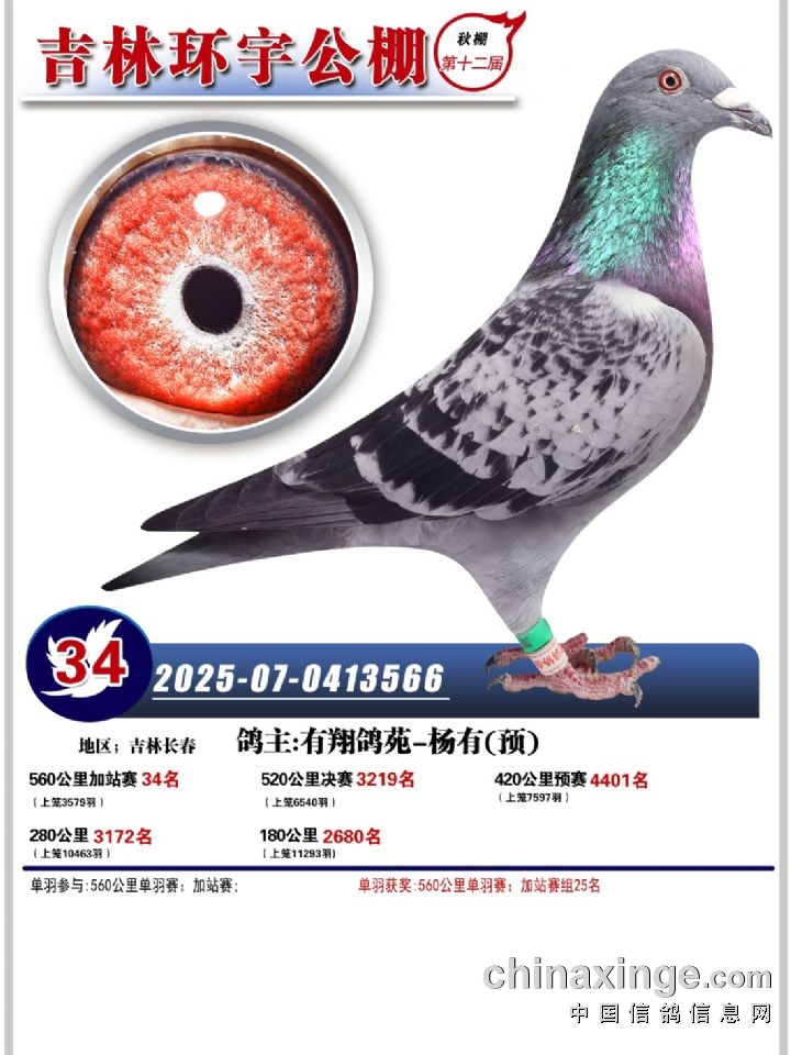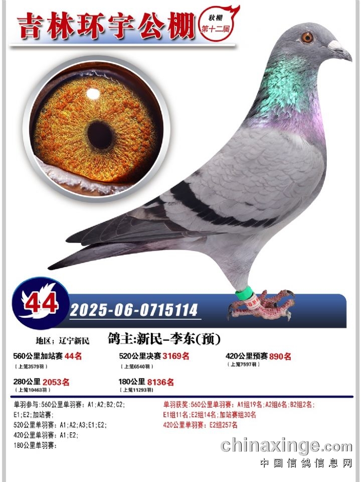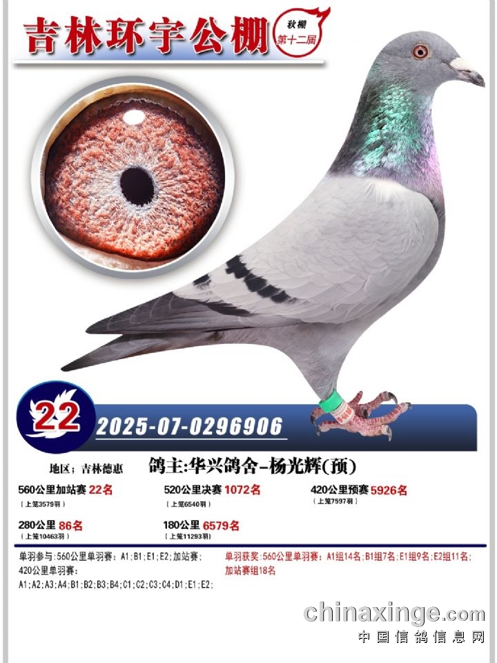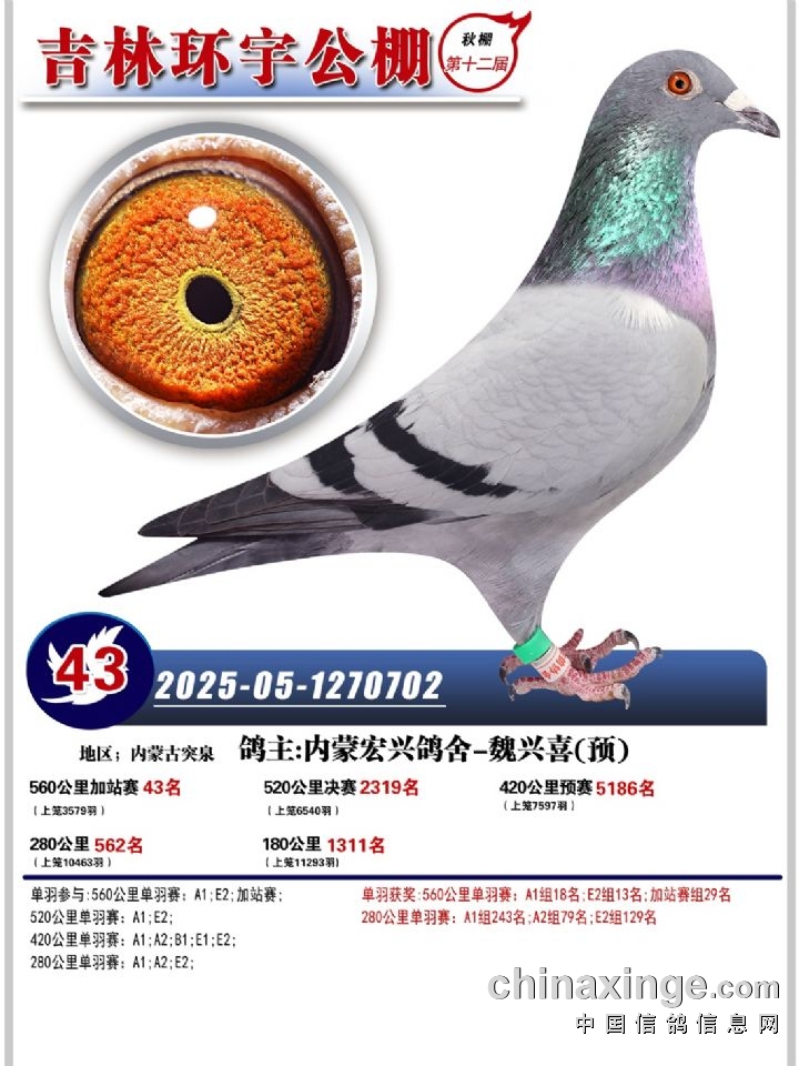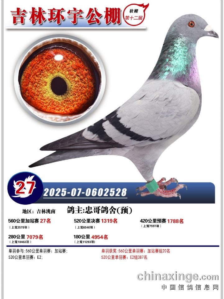吉林环宇(小)2025年加站赛1-15名获奖鸽照片赏析