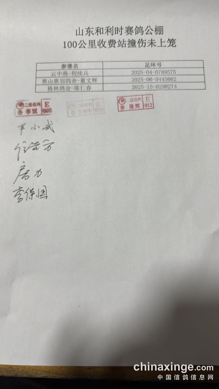山东和利时赛鸽公棚100公里收费站集鸽清单(按时间)