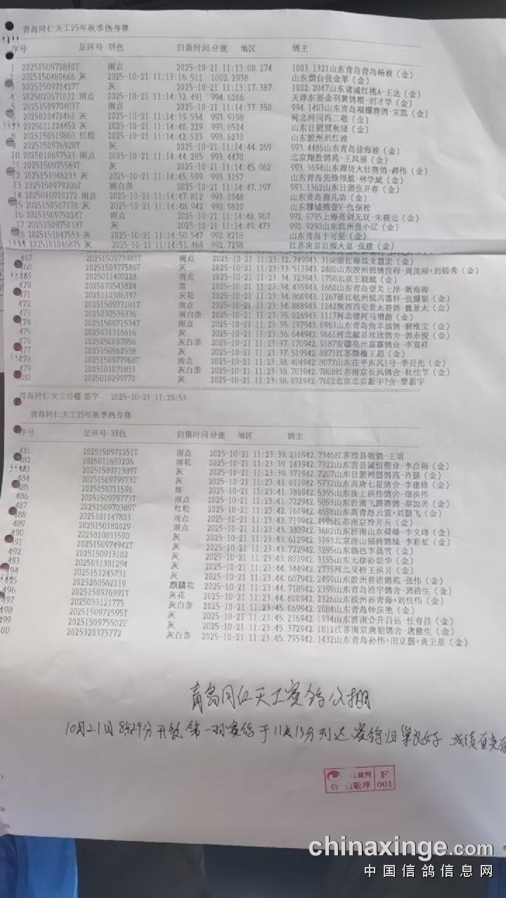 青岛同仁天工 获奖鸽迟归鸽发出公告(二)