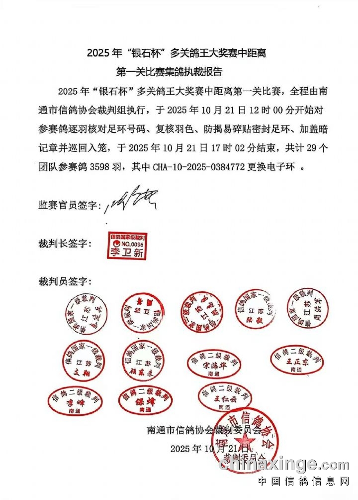2025年“银石杯”多关鸽王大奖赛第一关中距离赛集鸽工作于10月21日12时,在江苏银石赛鸽俱乐部集鸽大厅按抽签顺序准时进行。直至17时02分集鸽工作结束,共有29舍3598羽参赛鸽上笼参赛,预祝大家取得佳绩!