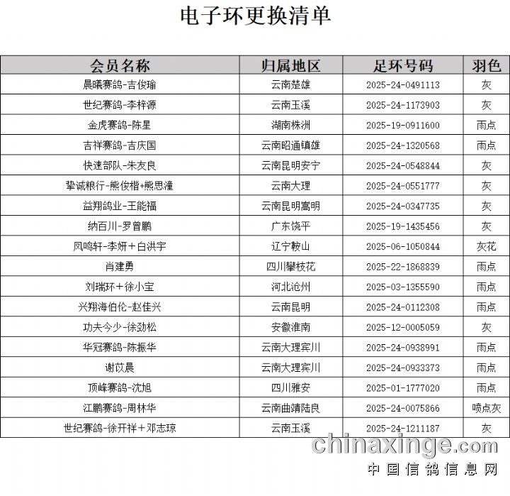 2025年天南铜都(大秋棚)第一关(200~230公里)逐羽扫描上笼清单