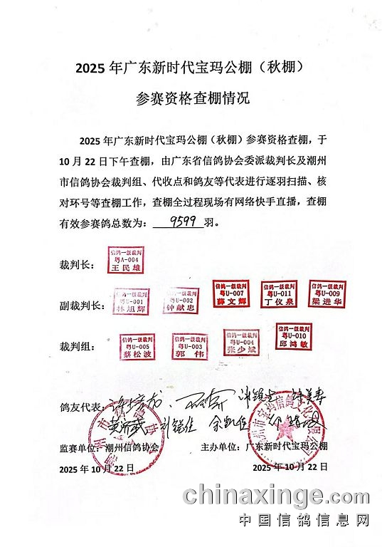 2025年广东新时代宝玛(秋棚)清棚工作已圆满完成,由广东省信鸽协会委派裁判长、潮州市裁判组进行逐羽扫描及足环号核对等清棚工作;共清点有效参赛鸽: 9599羽。