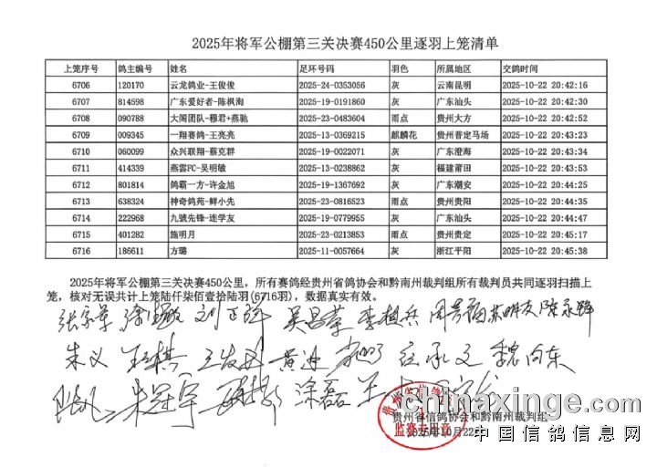 贵州将军公棚:2025年秋赛第三关450公里决赛逐羽上笼清单