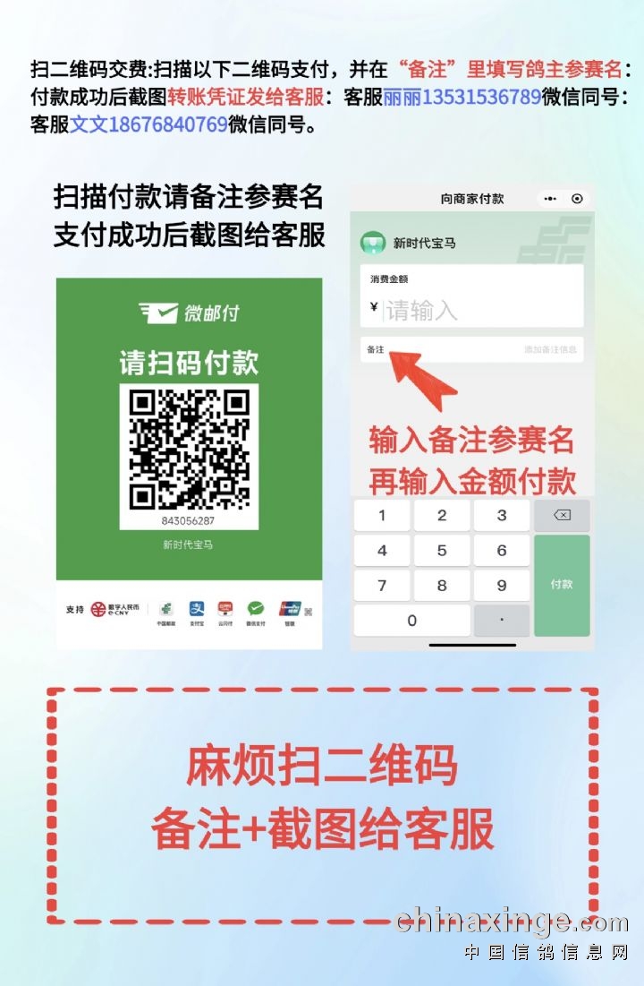 | 【广东新时代宝玛(秋棚)2025年收费通知】   广东新时代宝玛(秋棚)2025年清棚工作已圆满结束,清棚工作由广东省鸽协委派裁判长、潮州市裁判组、代收点及周边鸽友会员进行逐羽扫描,共清点有效参赛鸽共:9599羽。 一、因收费时间有限,为了高效、准确地完成每位鸽友的参赛费收费信息录入工作,新时代宝玛(秋棚)对收费事项作如下要求,希望能得到各位鸽友的理解与配合: 从10月24日起交费,每天9:00--21:00,截止日期10月28号,收费5天;参赛费:2000元/羽;参赛鸽主必须于5日内按实际存棚羽数交清个人名下的赛鸽参赛费,其赛鸽方才有资格参加接下来的训练及比赛; 如会员名下只存棚一羽,预存的报名费自动转为参赛费。 为避免后期出现忙乱现象,请各位鸽友尽量提前交费。 二、缴费渠道: 1.  现金交费: 地址:潮州市新时代宝玛公棚 电话:丽丽13531536789、文文18676840769(微信与手机同号) 2. 银行交费: 收款银行及账户: 中国建设银行6215 3403 0043 7400 527  户主:卢锡林(开户行:中国建设银行潮州浮洋支行) 交费人员向我棚公布的银行汇款交费后,将鸽主姓名、参赛名、交费内容、银行汇款凭证,填写清楚一并照像后用微信发至: 新时代宝玛客服--丽丽13531536789(微信与手机同号) 新时代宝玛客服--文文18676840769(微信与手机同号) 温馨提示:    1)请勿重复将汇款凭证发给多名客服员工,避免我们增加不必要的工作量;    2)银行汇款时注明实时到账,不接收ATM机24小时到账业务;我棚根据参赛费实到账时间登记交费记录;    3)银行交费须按我棚公布的收款帐户、账号汇款,向非我棚公布的银行或账户汇款造成的损失由汇款人自行承担。   3. 二维码交费:     请扫描以下二维码,填写支付金额,并在“备注”里填写清楚鸽主参赛名,转款成功后截图发给客服人员(备注:各家银行对支付宝和微信每日转出金额有限的,如果从卡里转不出去,建议提前充值到支付宝或微信余额再扫码) 1)微信或支付宝扫描下方二维码(您可以长按图片扫描或者用软件扫描) 2)确认转帐用户名称,输入转帐金额并备注好参赛名称 3)截图好转帐凭证,备注好参赛名称并发送给客服人员 新时代宝玛客服--丽丽13531536789(微信与手机同号) 新时代宝玛客服--文文18676840769(微信与手机同号)