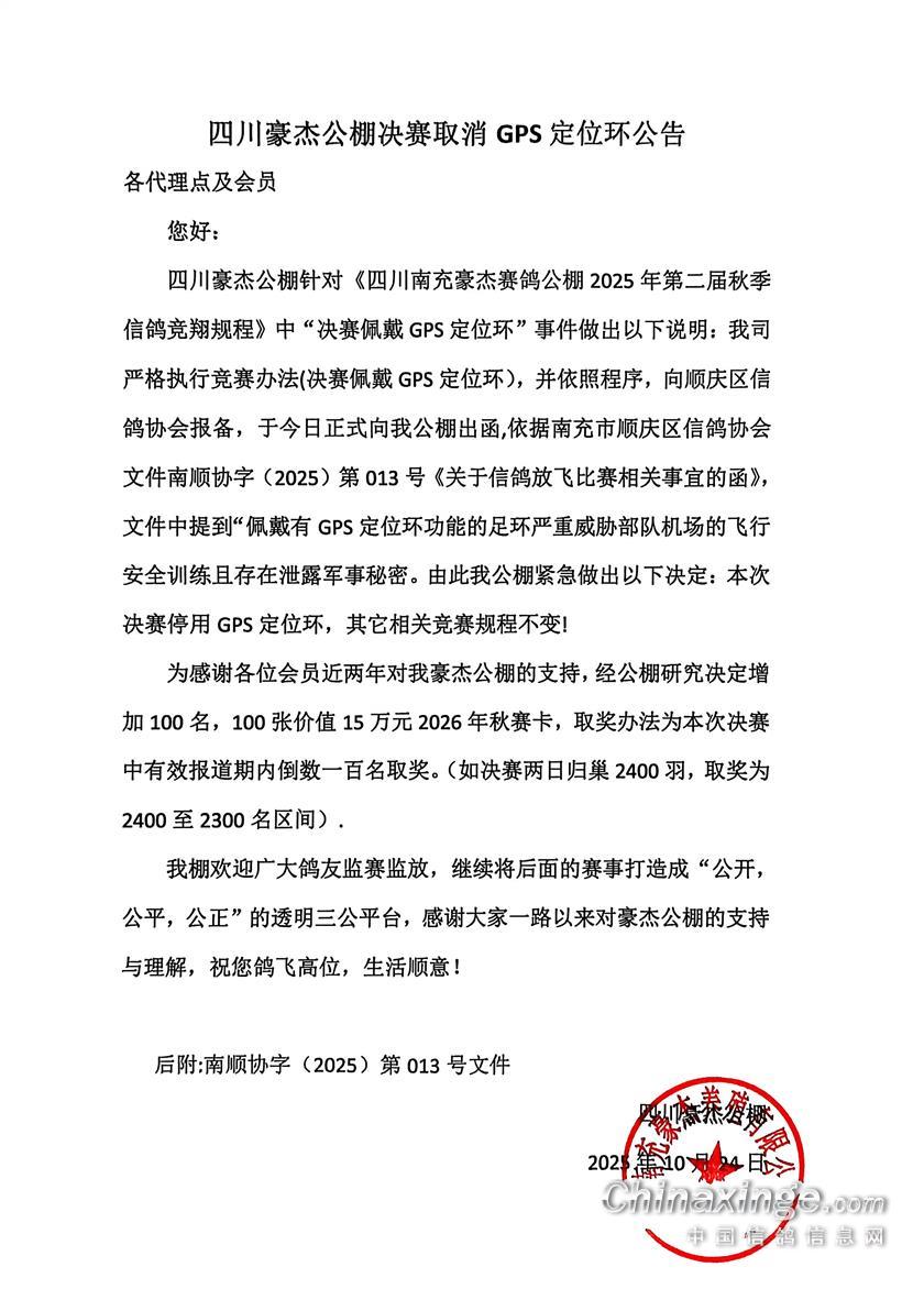 四川豪杰赛鸽公棚:2025年决赛奖金核对公示