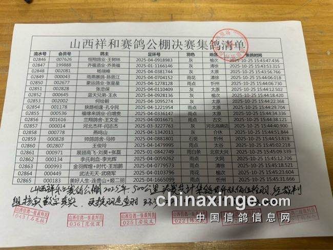 山西祥和赛鸽公棚500公里决赛监赛凭证