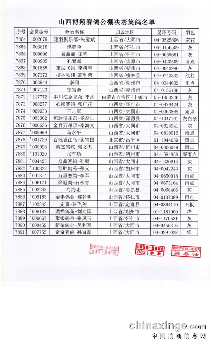山西博翔赛鸽公棚加站赛一日归巢名单(按时间)