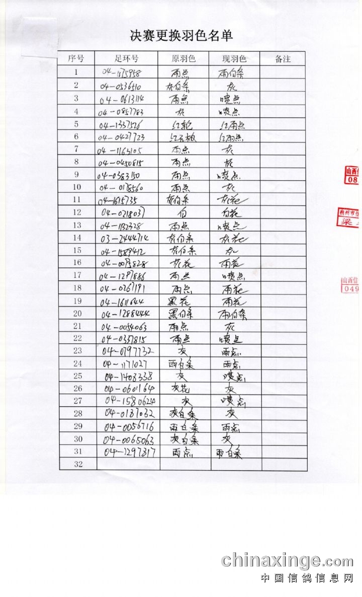 决赛更改羽色、电子环及集鸽名单执行裁判签字确认
