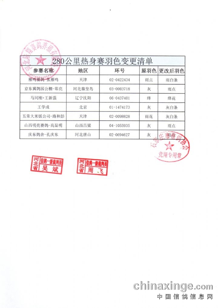 河北陆翔公棚:280公里热身赛集鸽清单