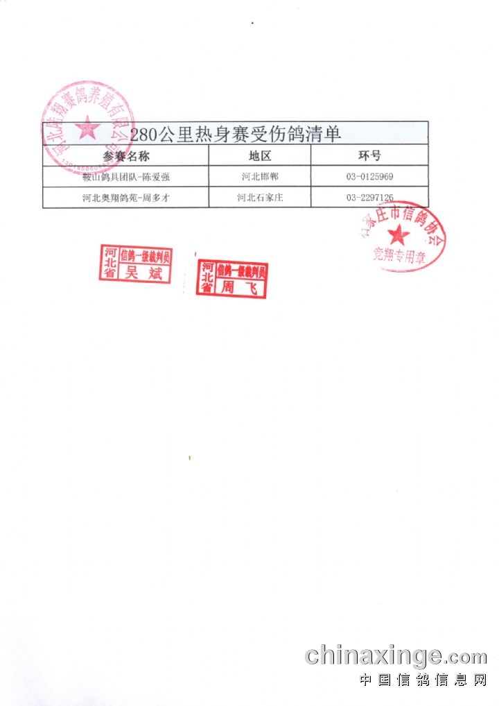 河北陆翔公棚280公里热身赛三日归巢比赛数据