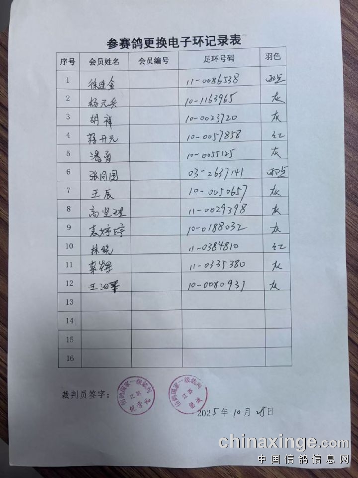 江苏弘腾赛鸽公棚:100公里(收费站)电子环更换名单