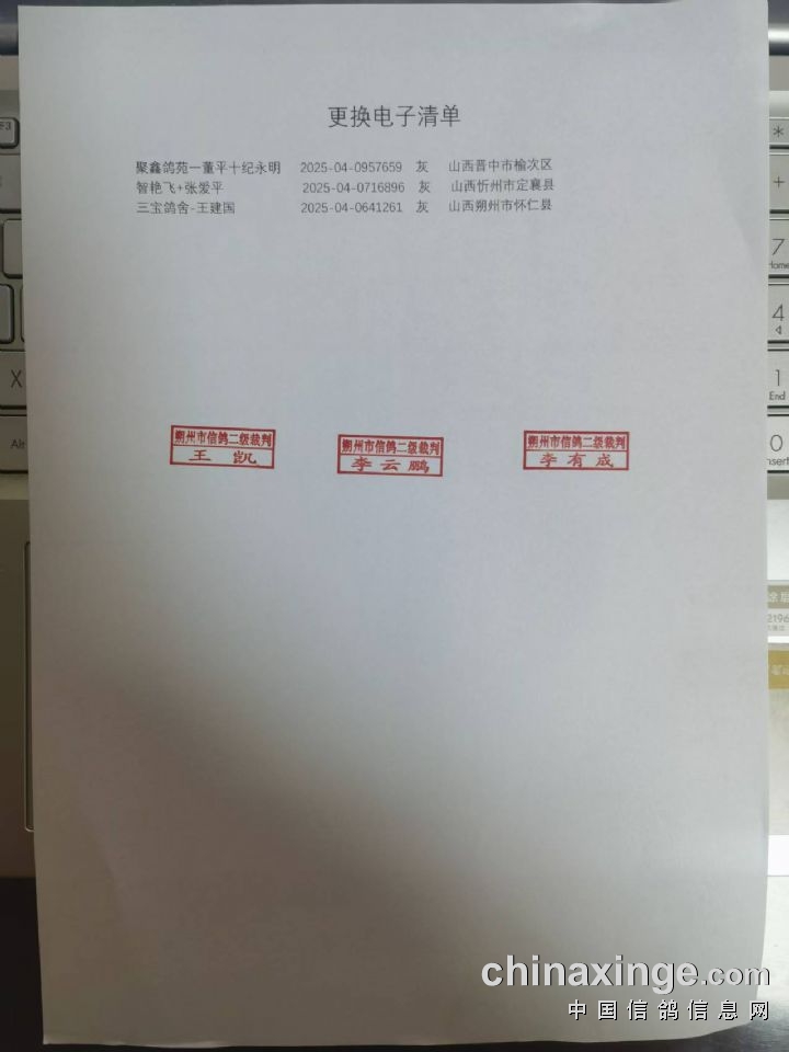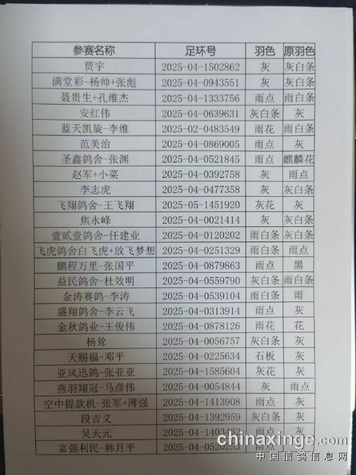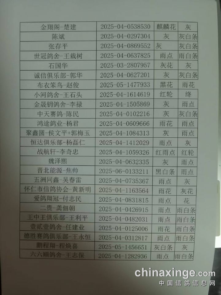 山西广武金翼赛鸽公棚决赛集鸽更改羽色、电子环名单