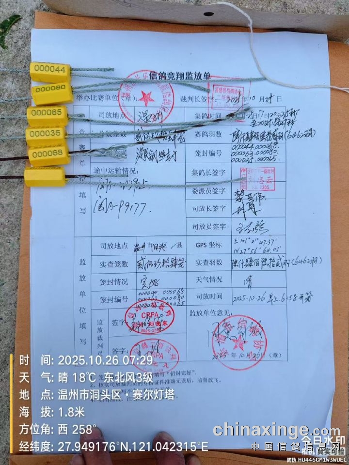 福建鼎诚赛鸽公棚【小棚】2025年280公里第一关已于10月26日上午6点58分开笼,司放地浙江温州,司放地经纬度:经度 121度,02分,47.37秒 , 纬度 27度,56分,46.03秒 ,司放地天气晴,赛鸽走势良好,预祝广大鸽友取得好成绩!