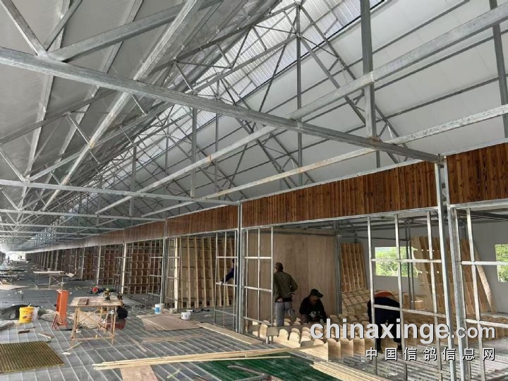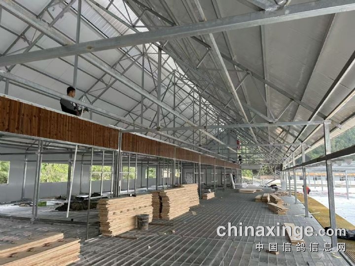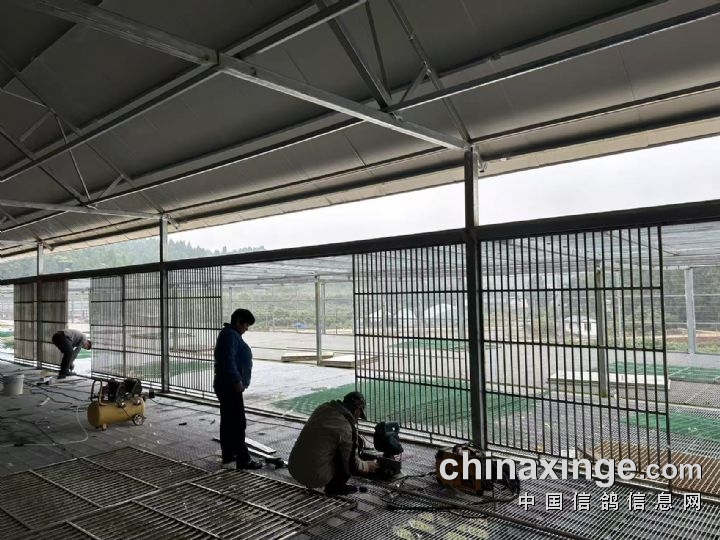 高顶钢架裹着秋雾,堆叠的板材正等变成赛鸽的“栖息墙”,公棚的骨架,藏着竞翔的底气。