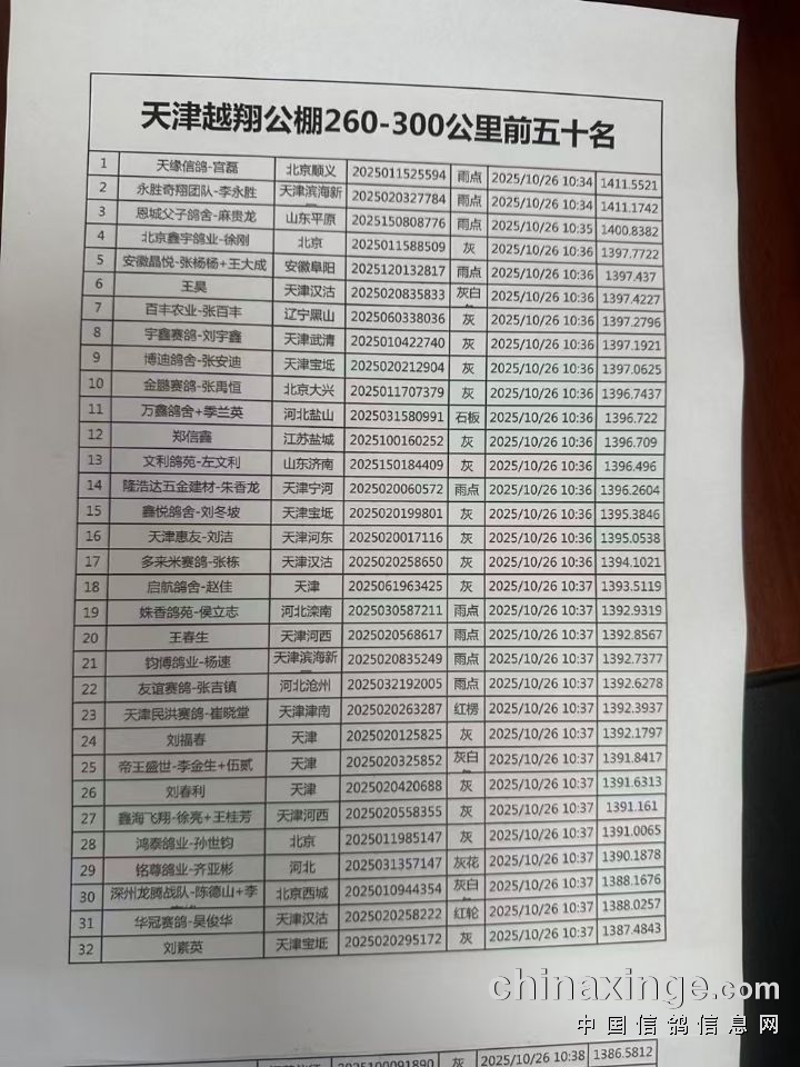 天津越翔公棚380-420公里技能赛明细(奖金三天无异议发放)