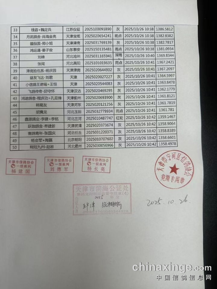 天津越翔公棚380-420公里预赛上笼人工逐羽扫描清单