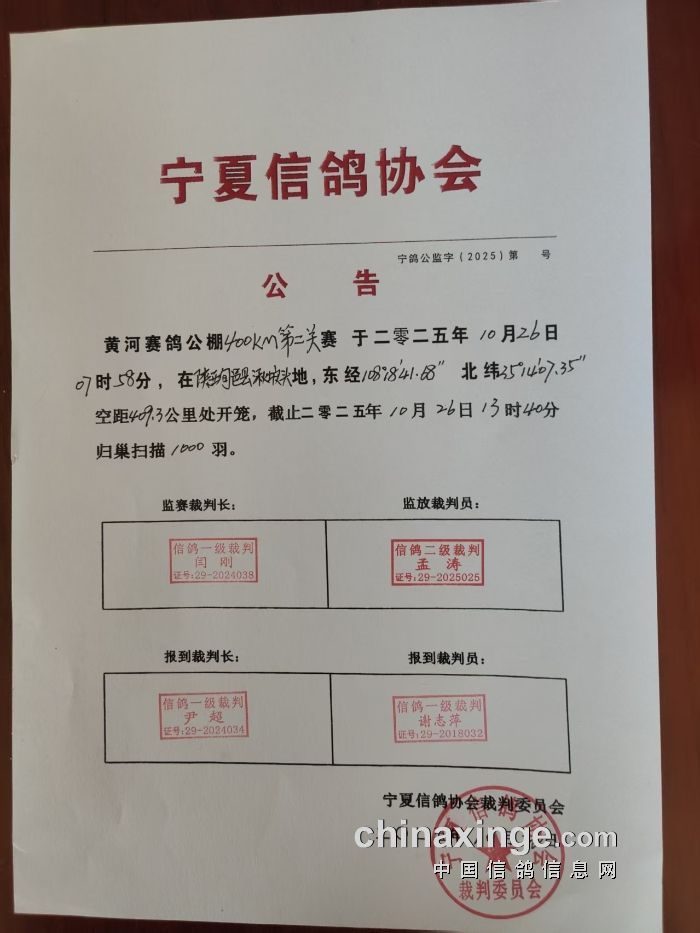 宁夏黄河赛鸽公棚第二关400公里奖金领取通知