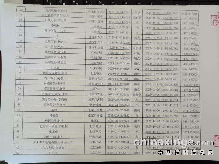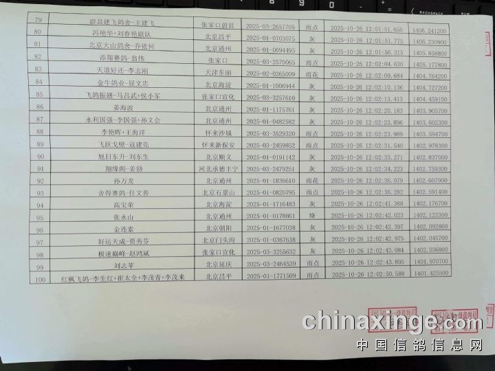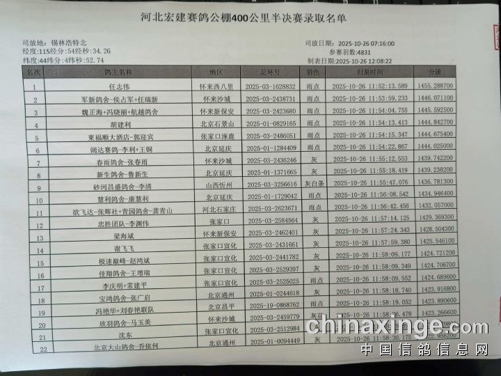 河北宏建赛鸽公棚400公里半决赛前100名证明