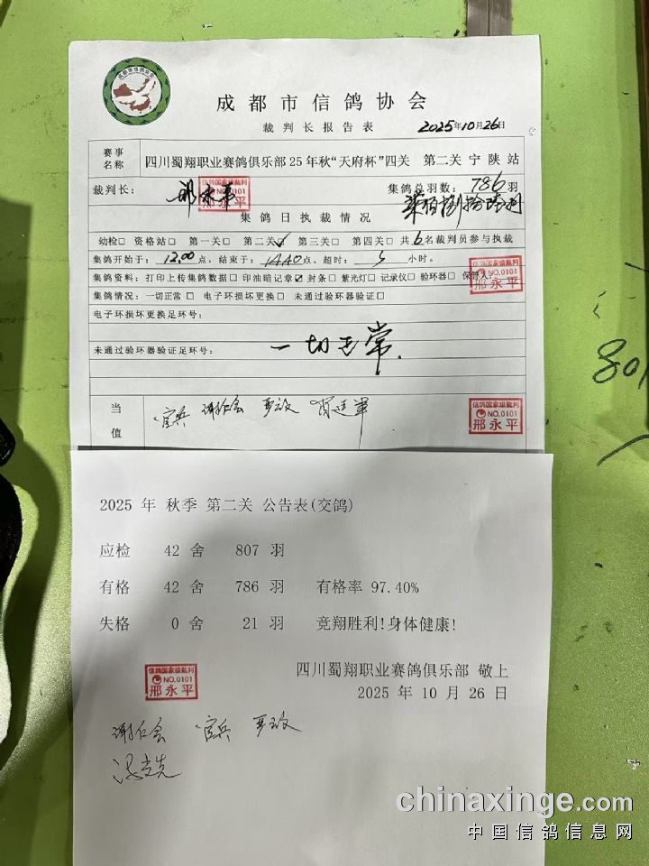 四川蜀翔职业赛鸽俱乐部2025年秋季“天府杯”职业赛第二关宁陕站集鸽工作在省鸽协委派裁判和成都市信鸽协会执裁裁判的认真执裁下,经全体参赛团队(鸽友)积极参与和支持,已于14点40圆满结束。总集鸽羽数786羽。现将集鸽执裁报告及相关数据公示如下(所有集鸽原始单据、存根由执裁裁判保管,待比赛结束验鸽时开启核对):