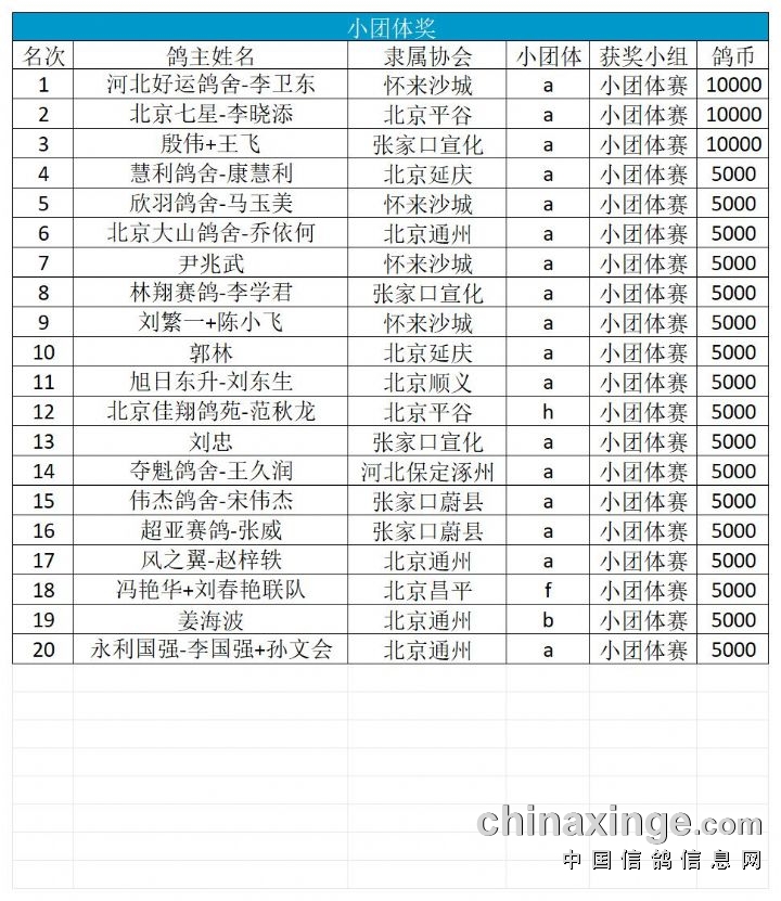 河北宏建赛鸽公棚400公里半决赛小团体取奖名单